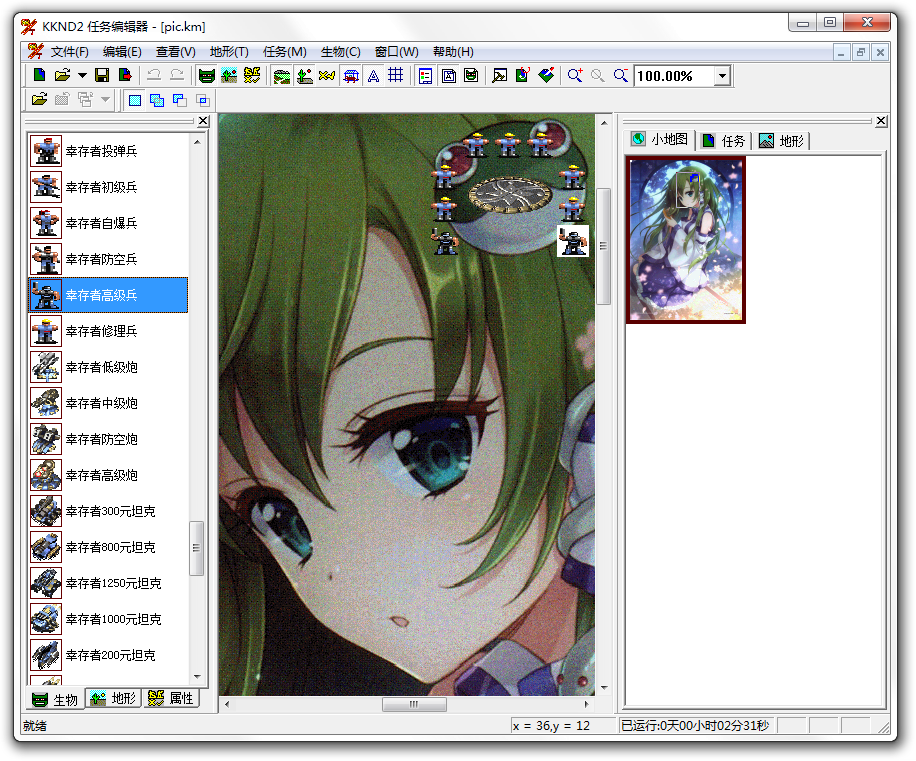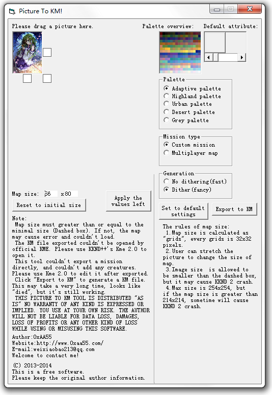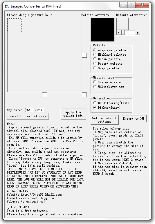 This tool can convert an entire picture file into a KKND 2 mission file, a KM file. It will work with any photos or pictures, you can even take a photo with your camera and use this as a map!